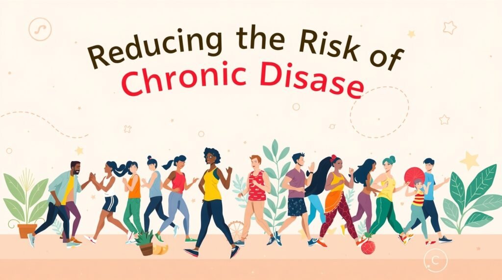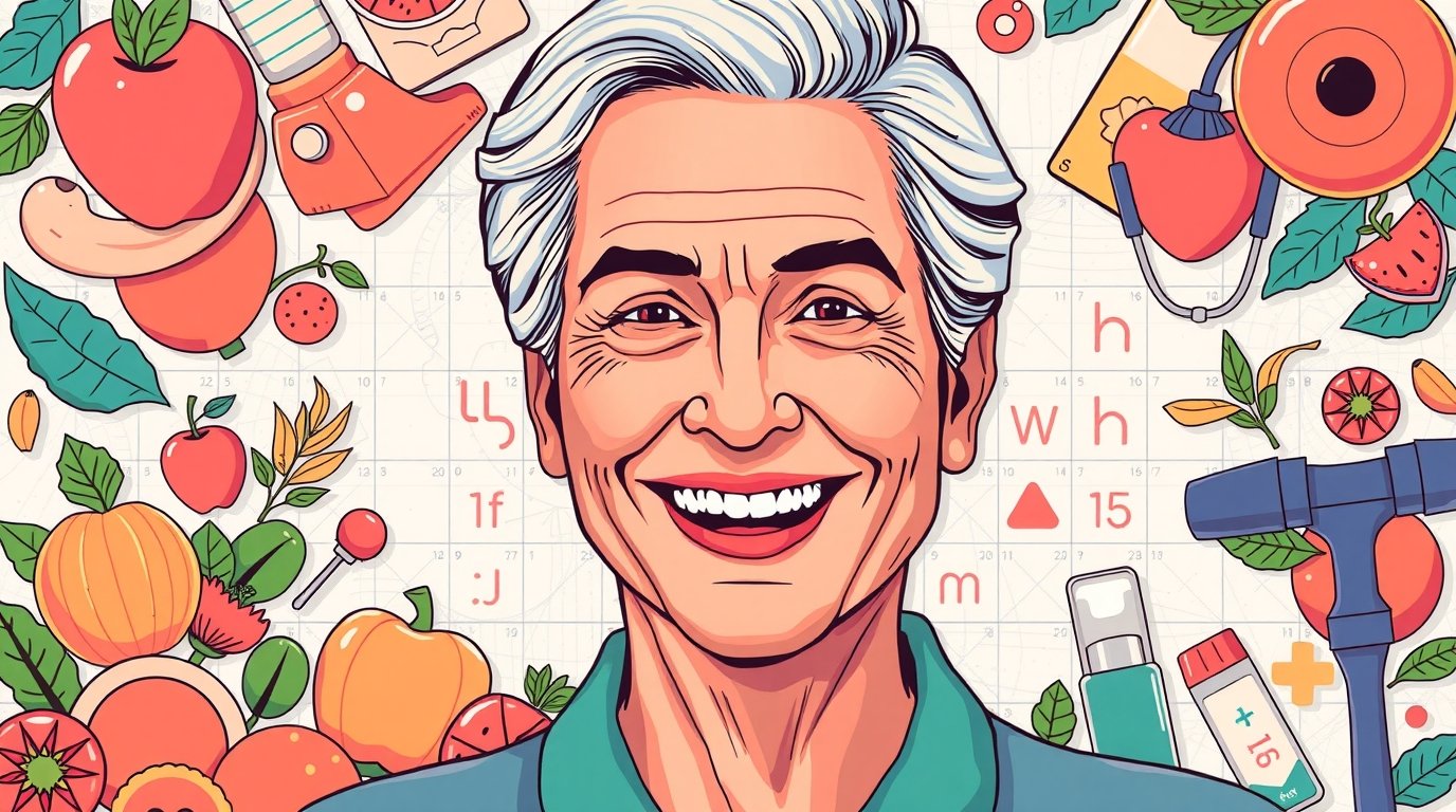 A visual of healthy lifestyle habits — balanced food, walking, heart-health icons, and medical monitoring symbols.